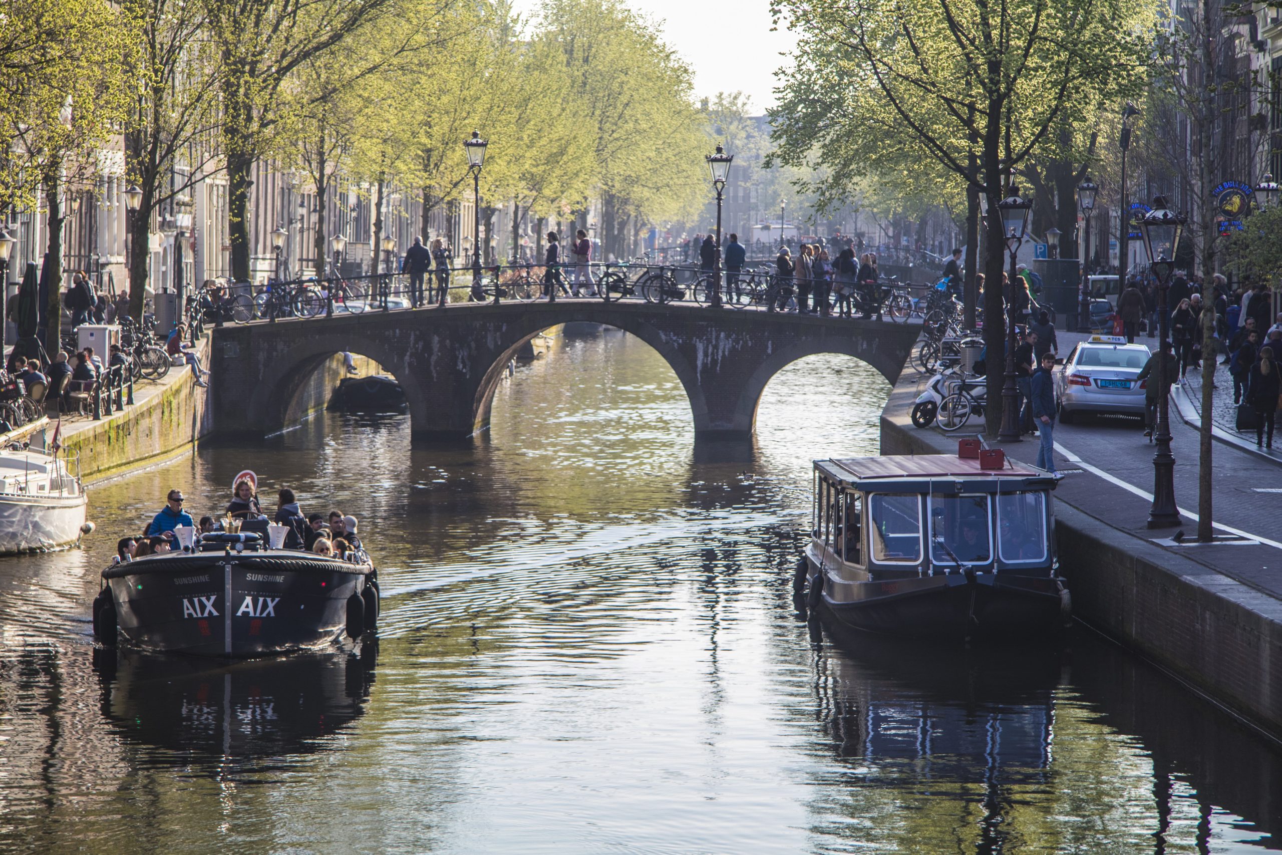 This is a beautiful and lively scene of Amsterdam’s canals, capturing the essence of the city’s charm. The arched brick bridge, lined with bicycles and pedestrians, adds depth and character to the image. The tourist boats on the canal, along with people strolling along the sidewalks, create a vibrant and inviting atmosphere. The soft sunlight filtering through the green trees enhances the warm and relaxed mood of the scene.